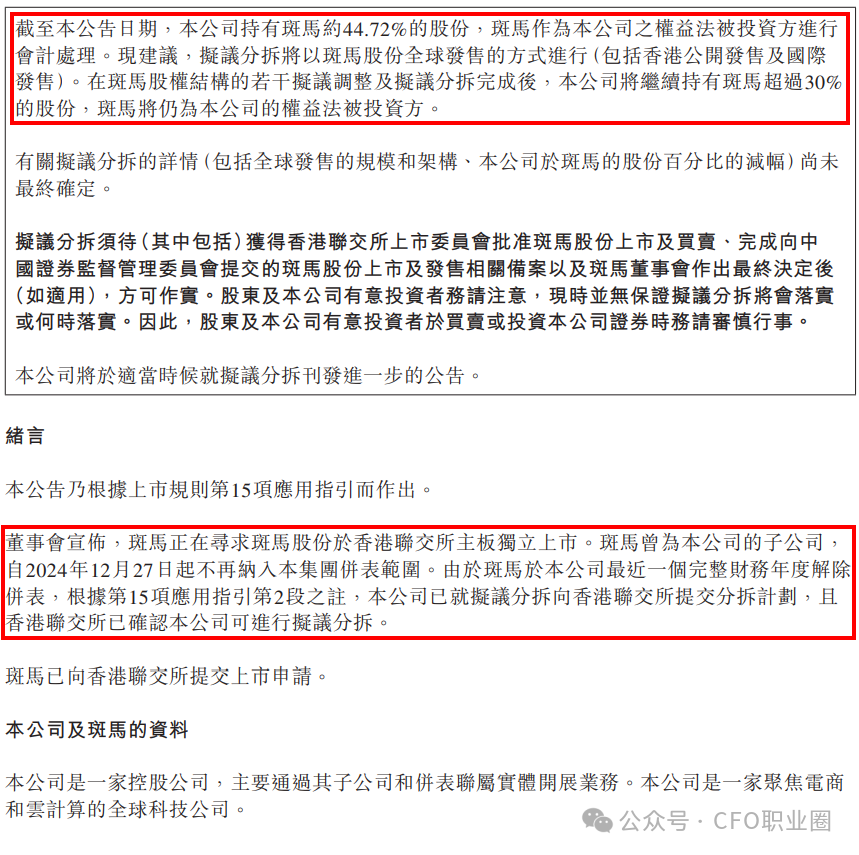 截至公告日,阿里集团持有斑马约44.72%的股份。在斑马网络股权架构的若干提议调整及分拆完成后,阿里将继续持有斑马超过30%的股份,并以权益法进行会计处理。
