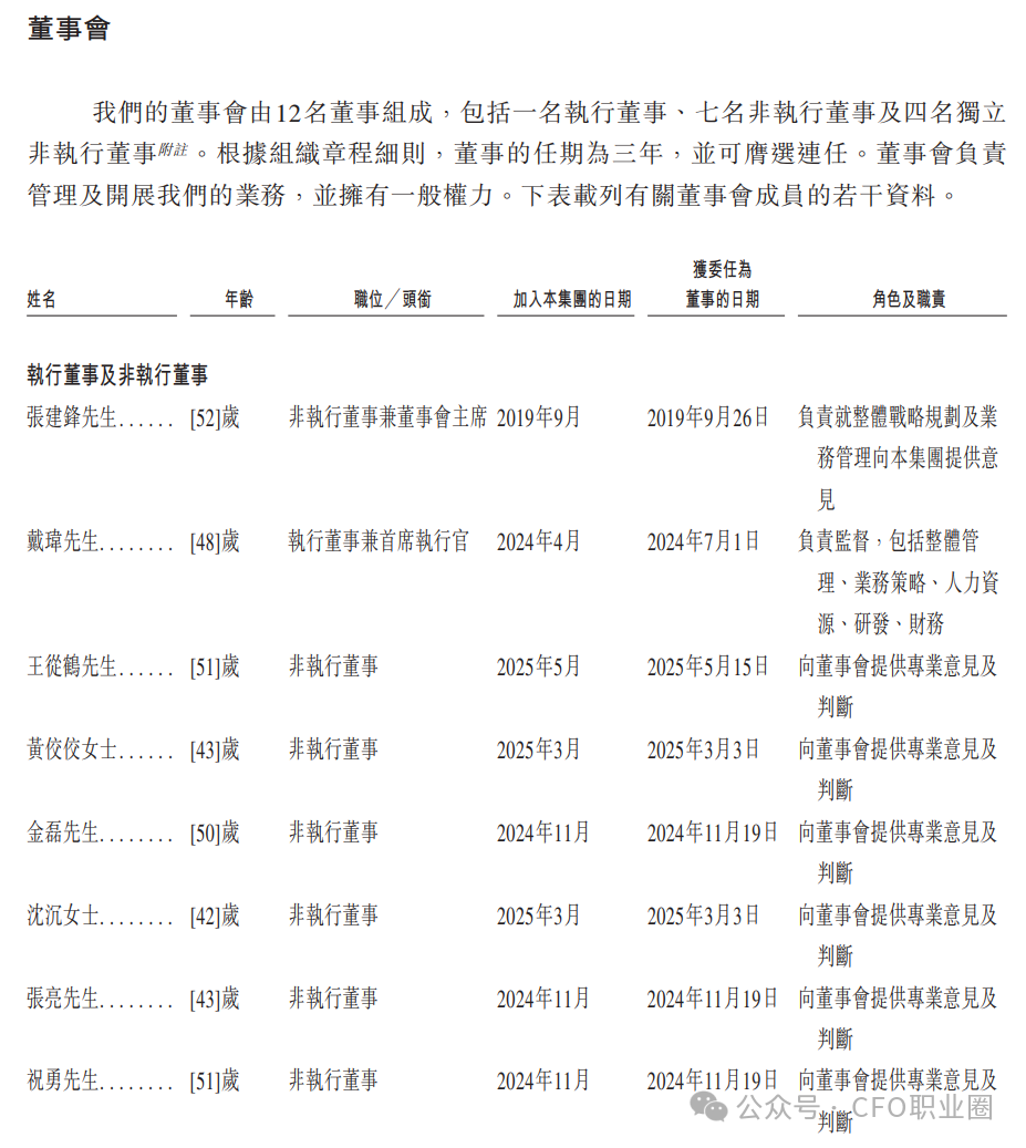 戴玮先生,48岁,于2024年7月获委任为该公司董事,并于2025年8月调任为执行董事。戴先生自2024年4月起担任该公司首席执行官,负责监督,包括整体管理、包括业务策略、人力资源、研发、财务。