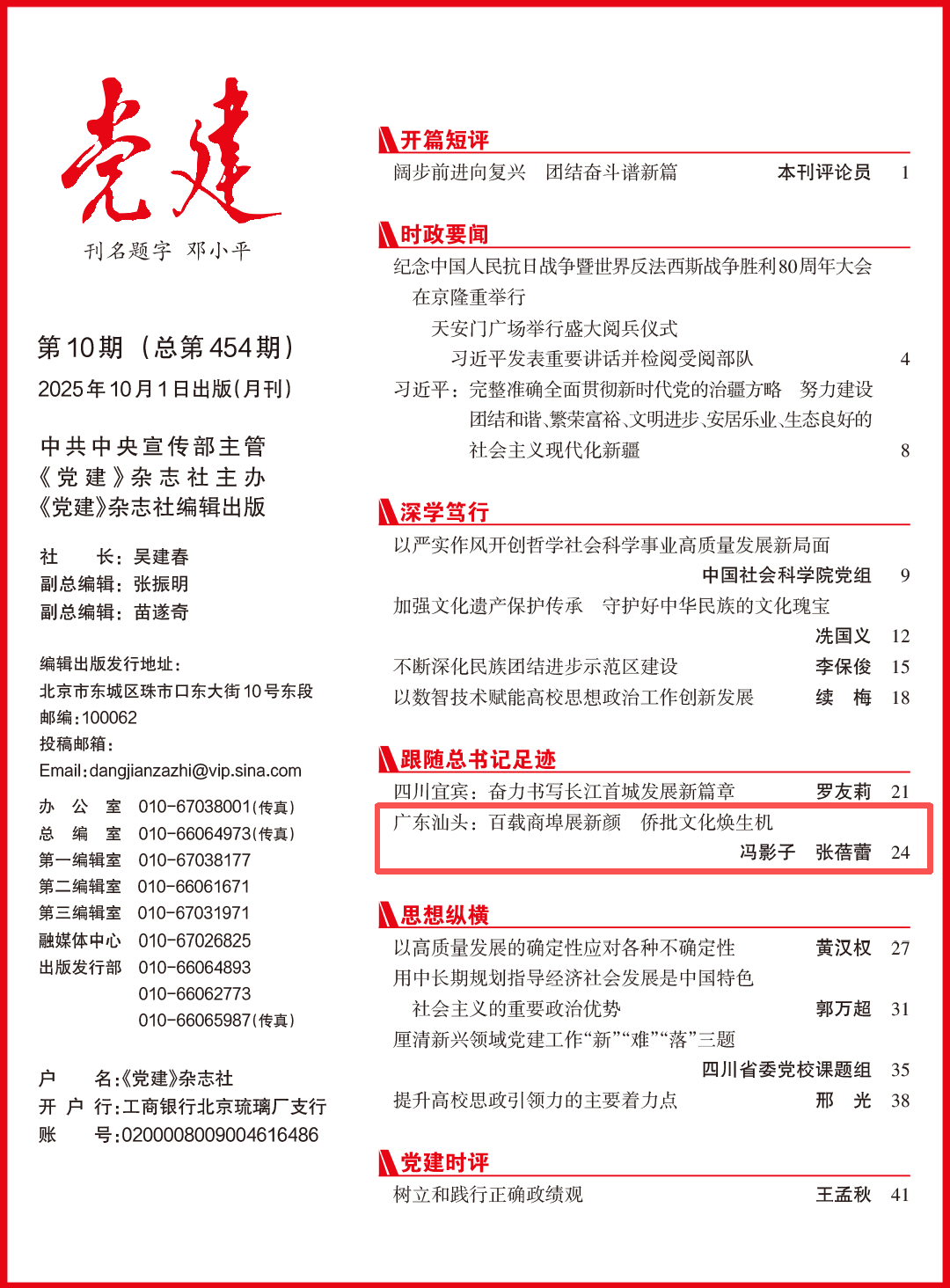 10月9日,2025年第10期《党建》杂志刊发《南方》杂志记者文章《广东汕头:百载商埠展新颜 侨批文化焕生机》,关注报道汕头坚持守正创新,系统推进历史文化街区保护和侨批文化传承,用文化厚度托举城市高度,坚定不移做好新时代“侨”的文章,进一步加强和改进侨务工作鼎金投资,切实将“侨”的优势转化为汕头发展新优势。