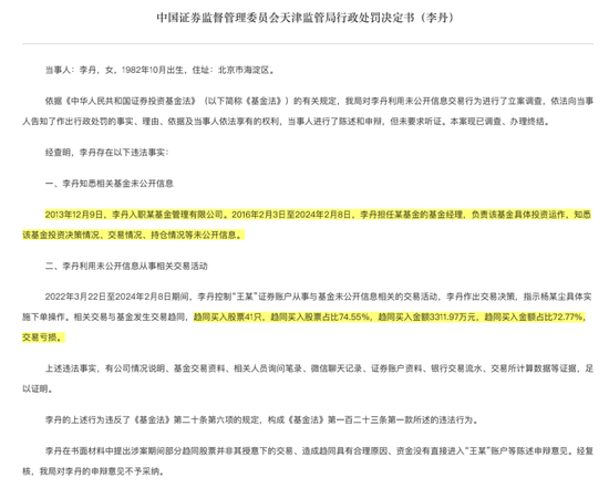 80后女基金经理李丹用他人账户、指示他人下单“炒股”2年,趋同买入3300多万元,亏了,事发被罚60万元。